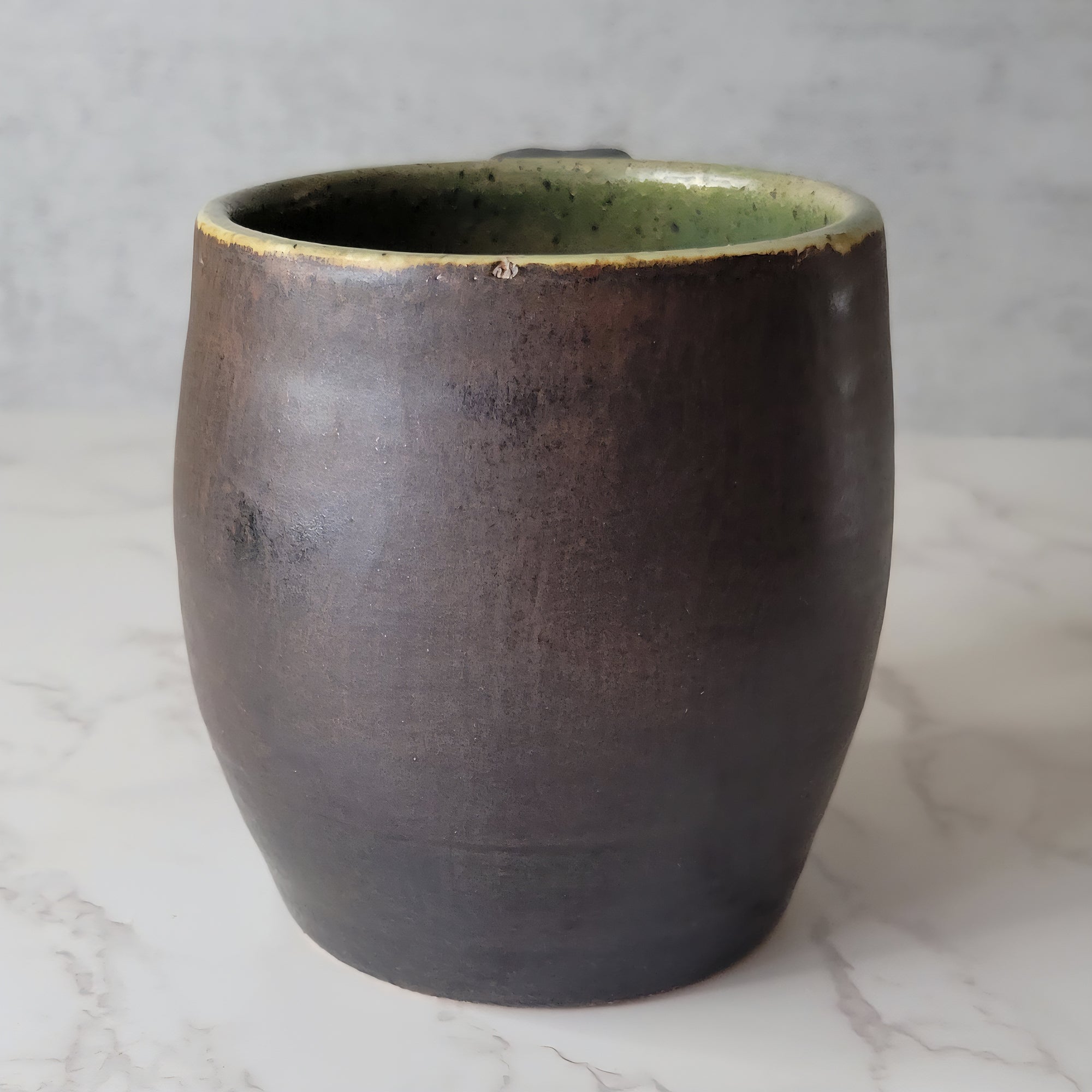 14 ounce Copper Brown and Green Tea colored mug with handle. Two toned matte finished mug that hold your favorite hot or cold beverage. Measures 3.75 inches tall, and 3 inches wide. Microwave/Dishwasher/Food safe.