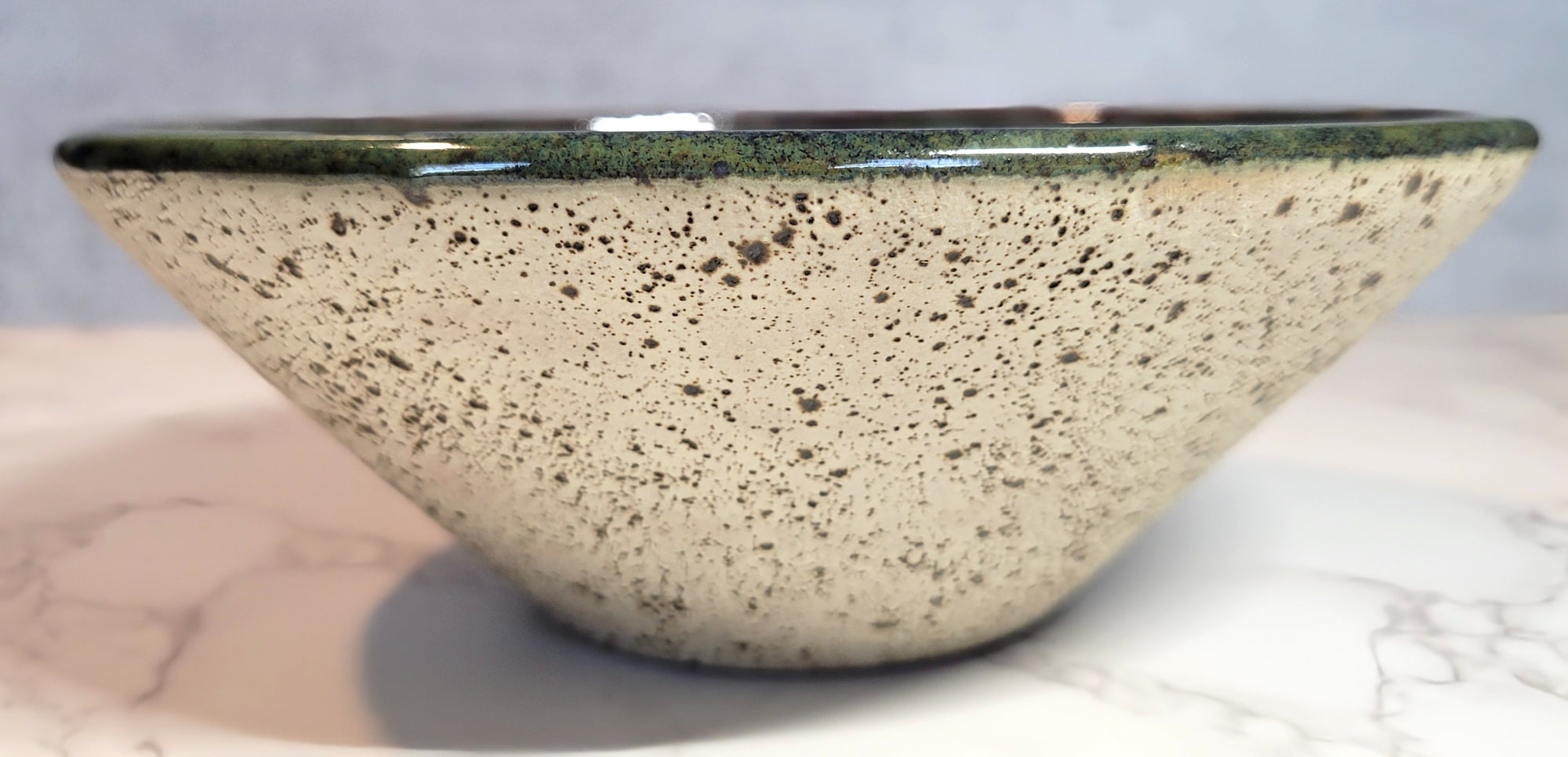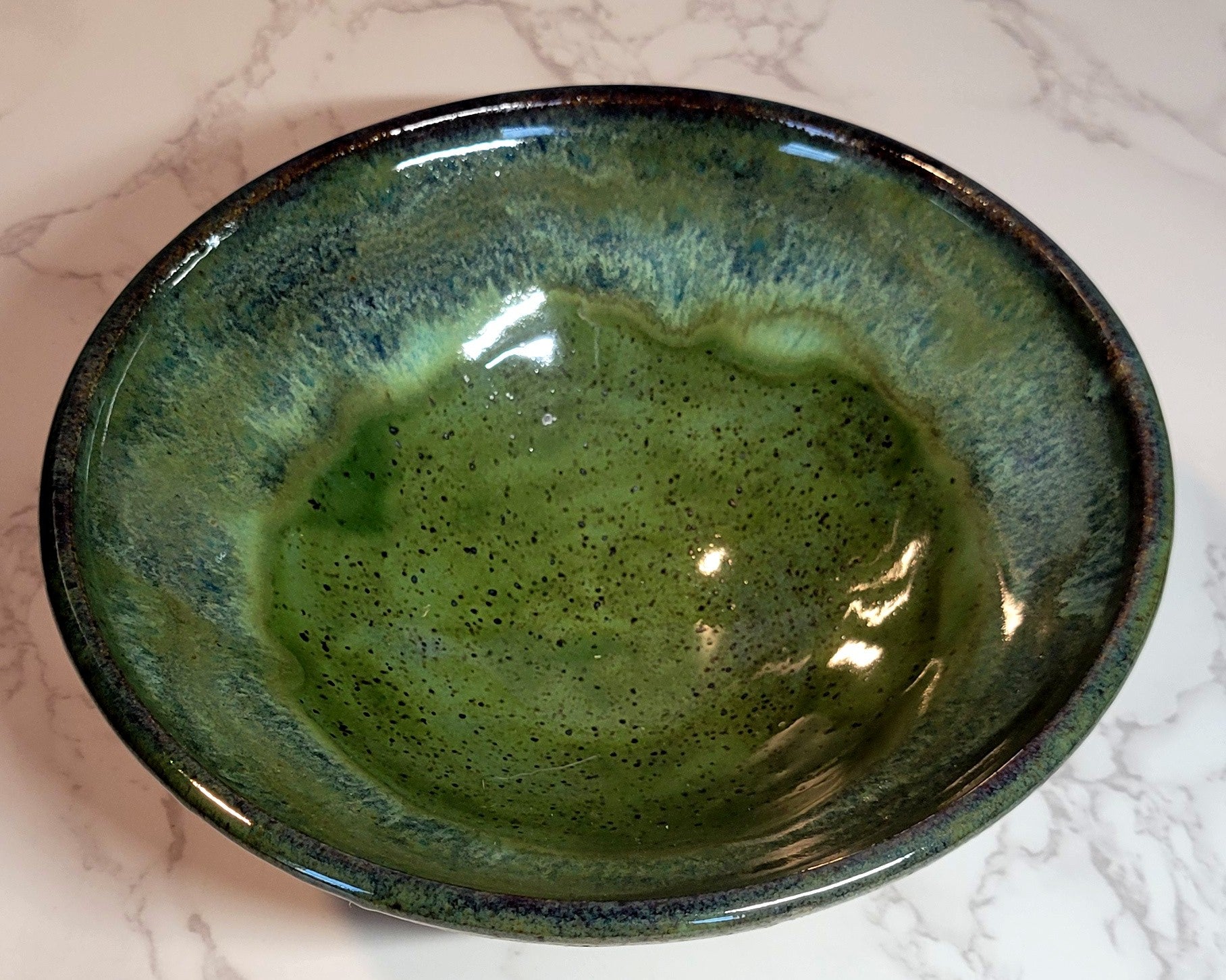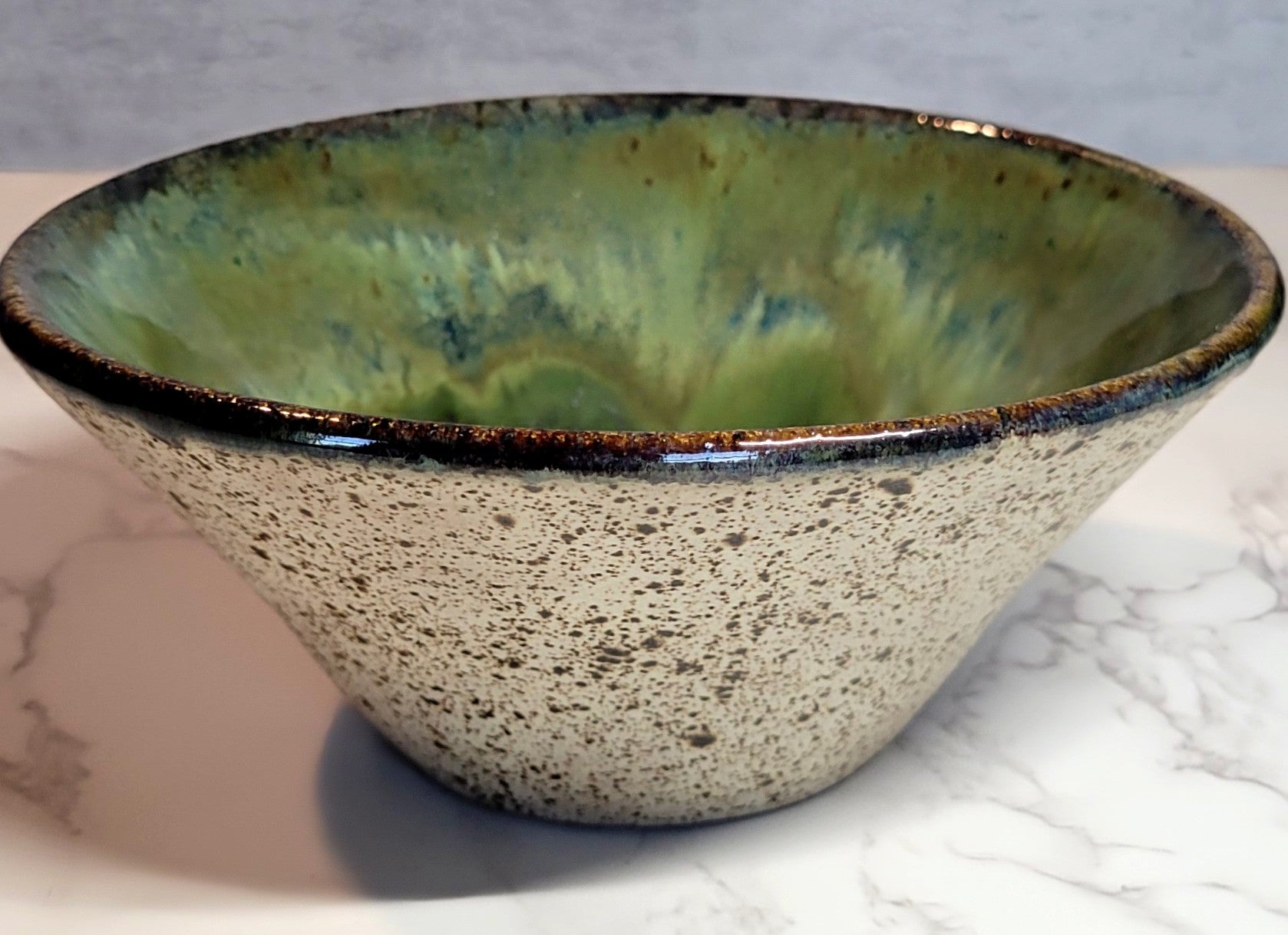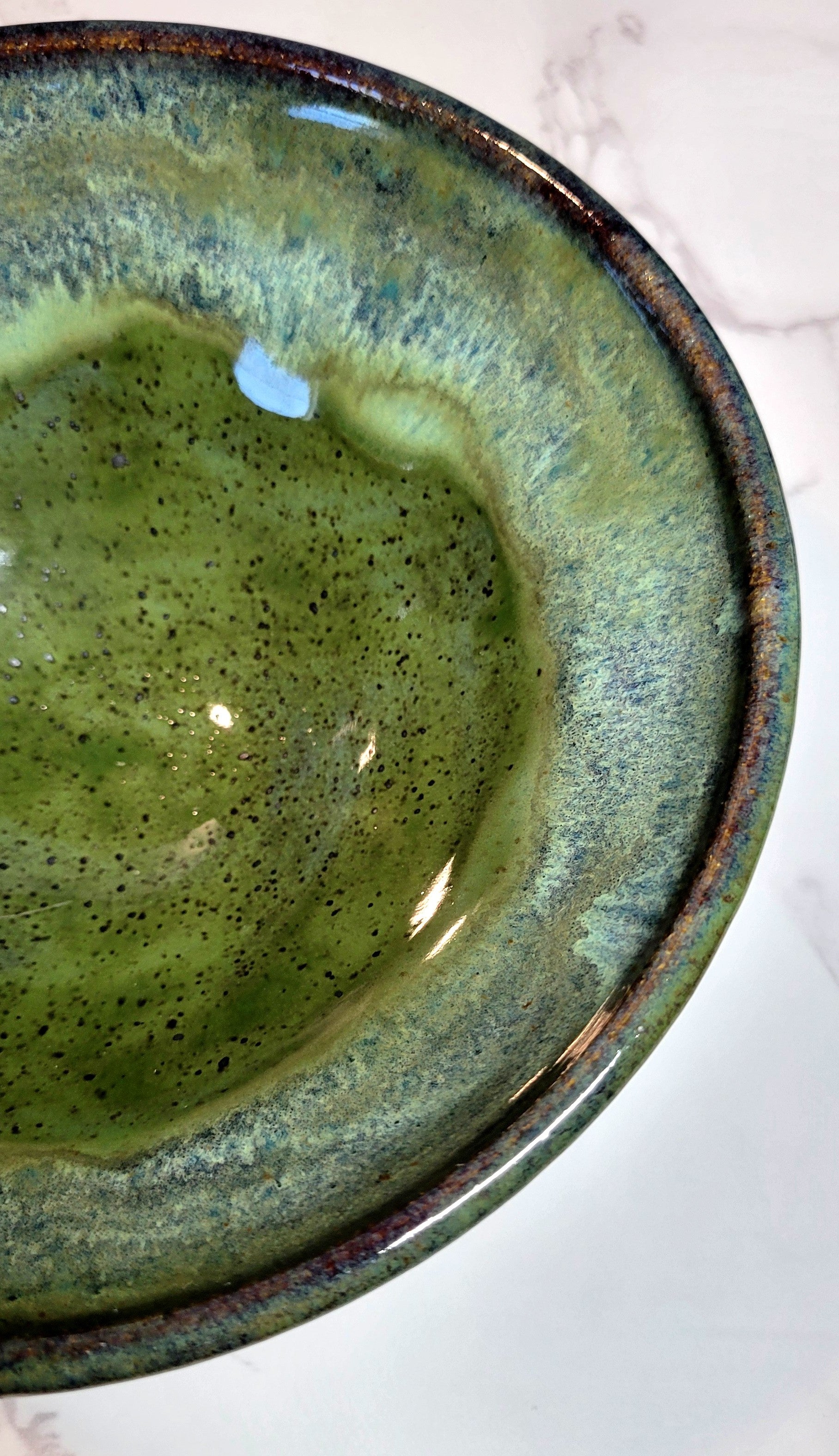 Green and Speckled bowl. This bowl is shiny sea green over matte speckled glaze. Reminiscent of seaweed in the sea. Measures 6 inches wide by 2.5 inches tall. Microwave/Dishwasher/Food safe.