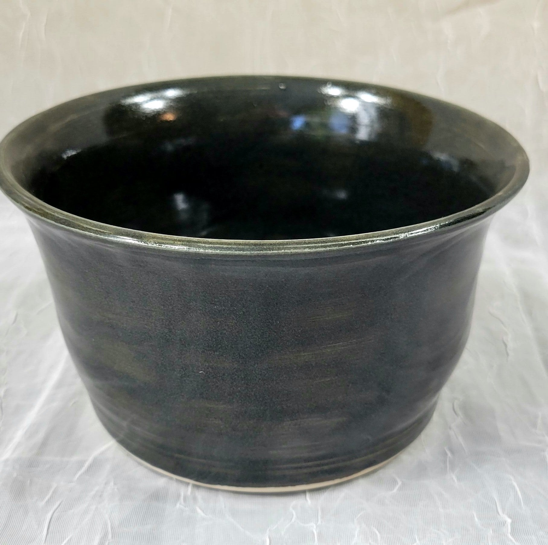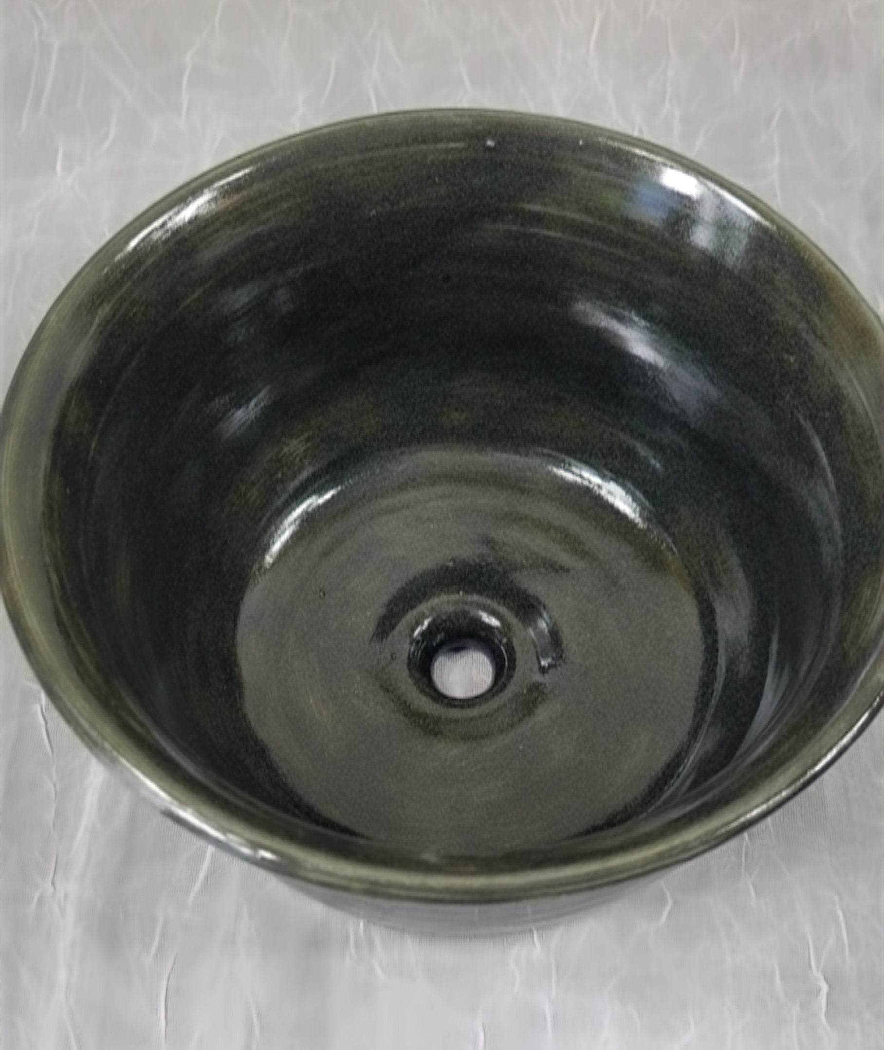 Green planter on dark brown base with drainage hole. Measures 3.5 inches tall and 6 inches tall.