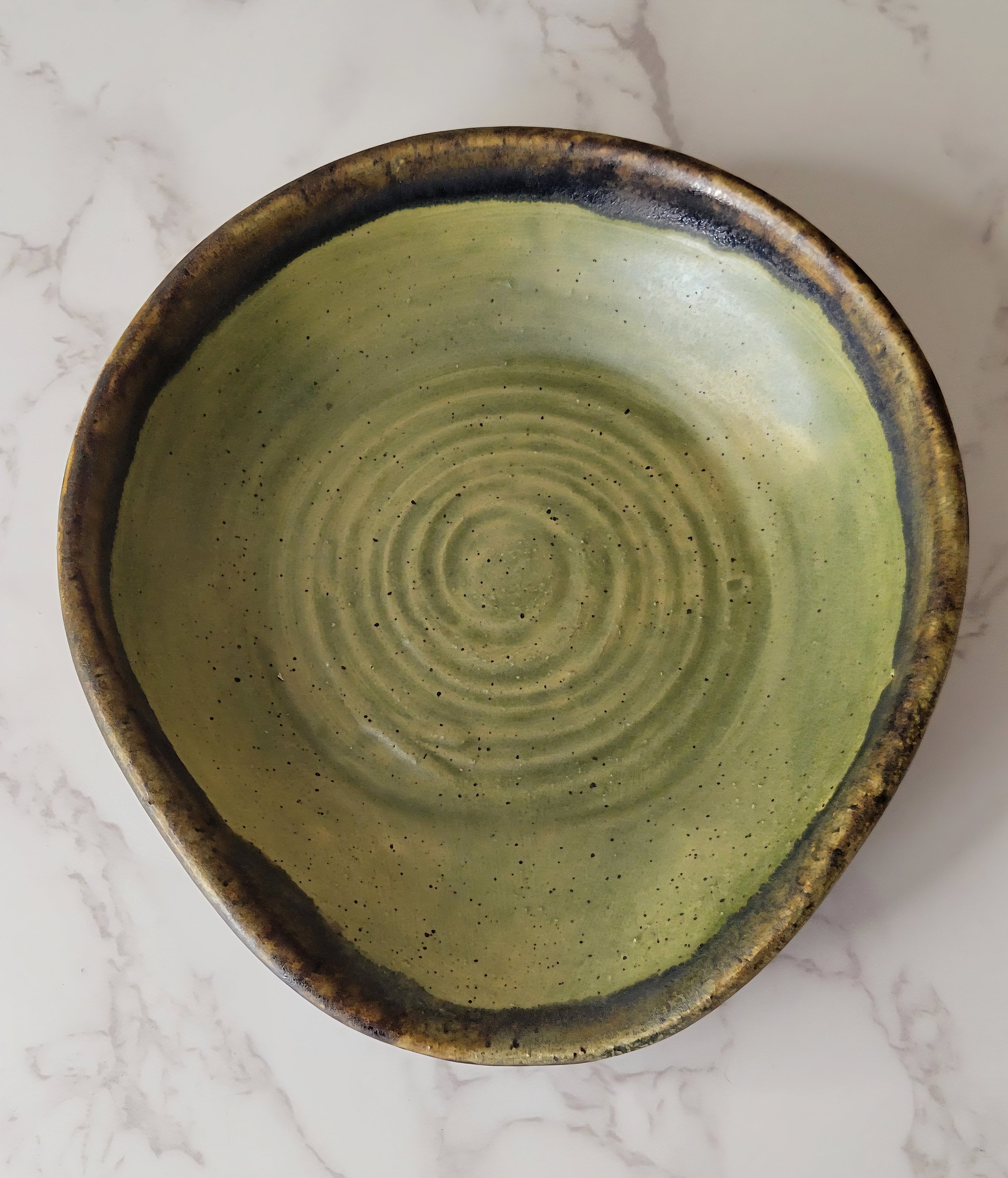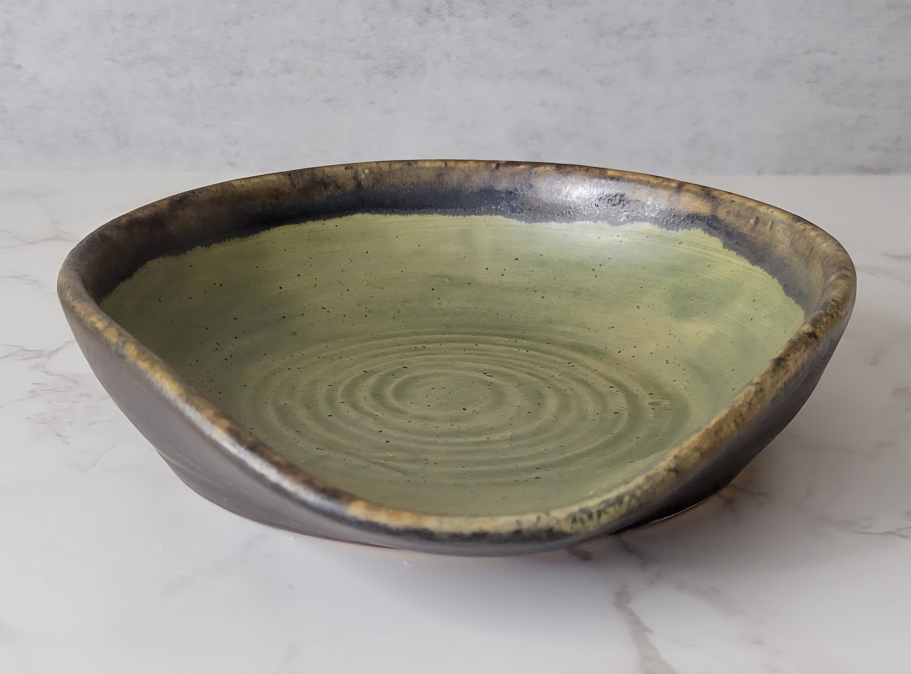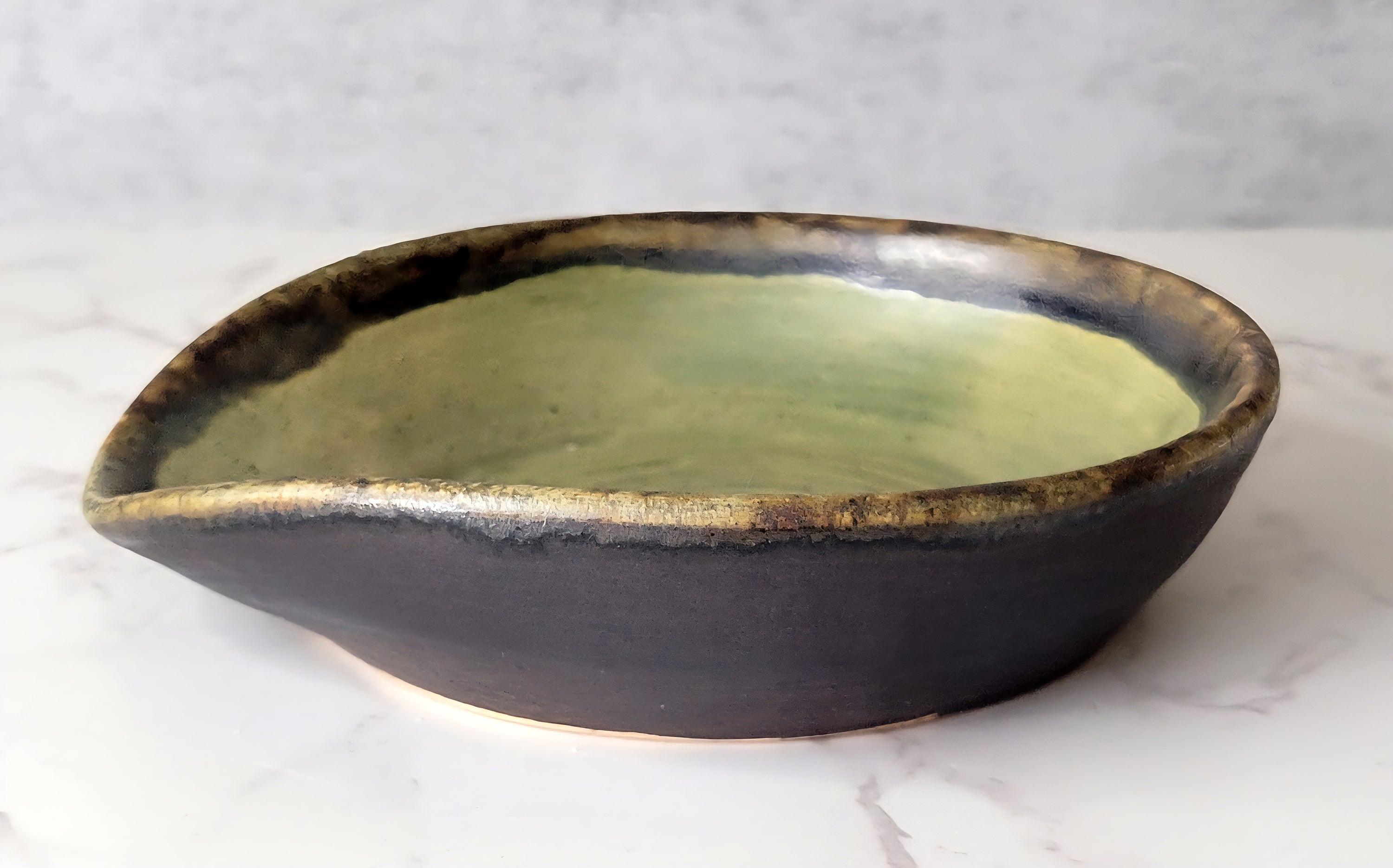 Copper Brown and Green tea colored matte spoon rest. Measures 5 inches wide by 1.25 inches tall. Microwave/Dishwasher/Food safe.